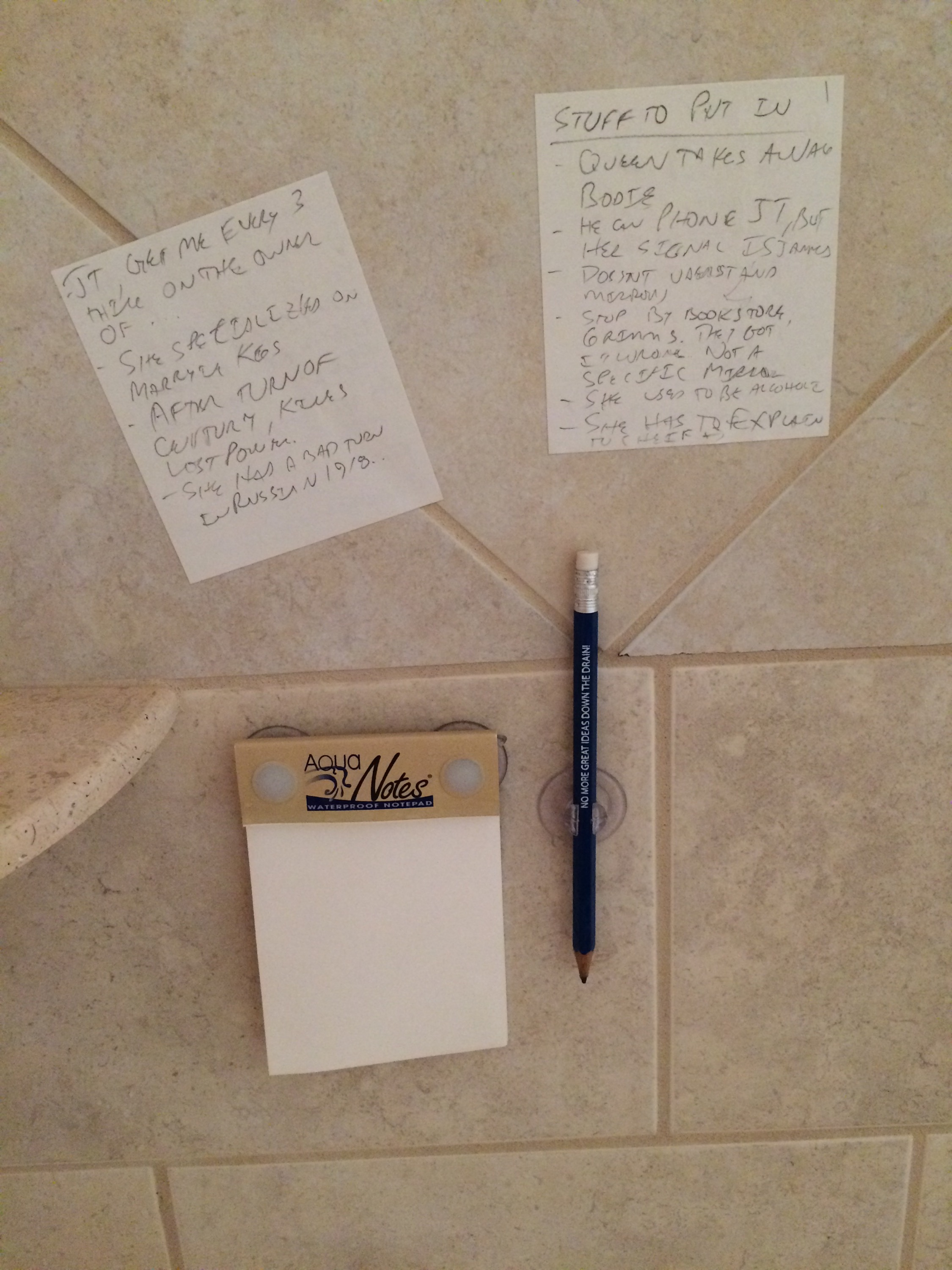 My friend, author Andrea Judy, put me on to Aqua Notes: a little notebook you can keep in the shower. I bought one off Amazon, and for last night’s writing session (posting this blog a day late as I’m walking to work), I took advantage. Here are a few notes I took, and yes, you can stick the paper on the shower tile: