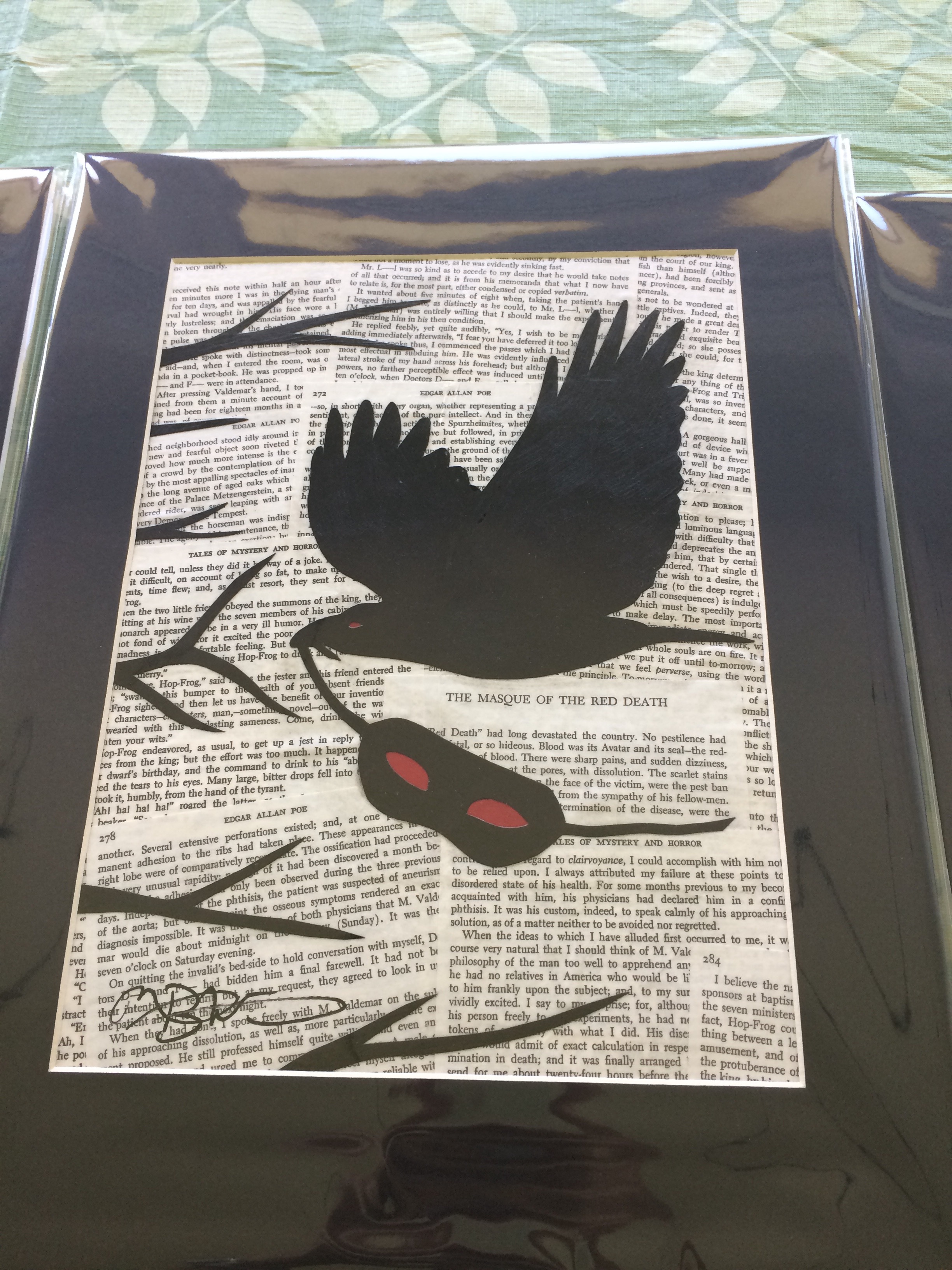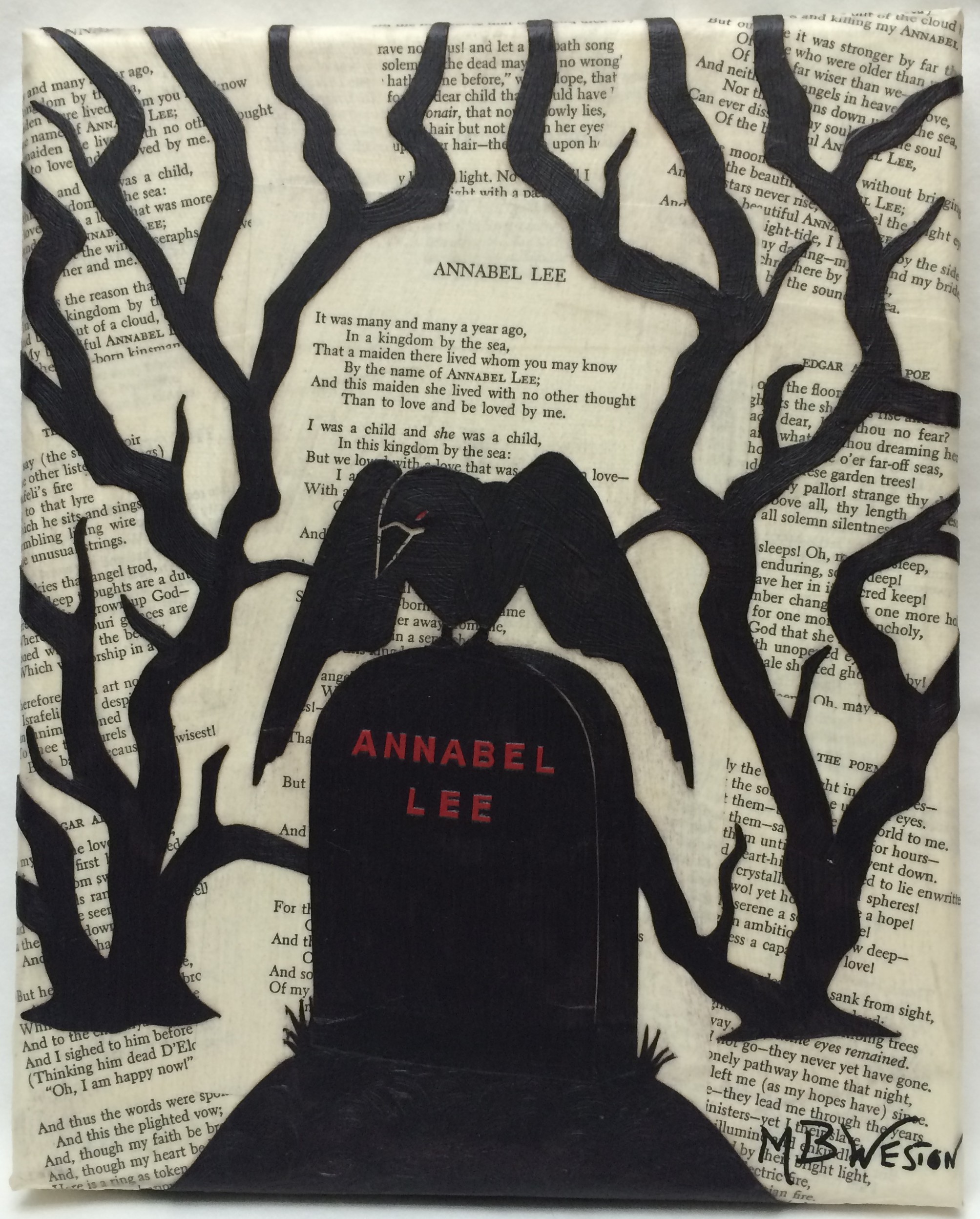 The Poe series is collage/decoupage art with silhouettes that illustrate some of Poe’s most beloved (and creepy) stories. I used actually pages from hard cover books for the creations. I also have tried to feature a raven in each one because…well, it’s about Edgar Allan Poe! Once I finish some smaller collage pieces, I’m going to turn some of these into watercolors.